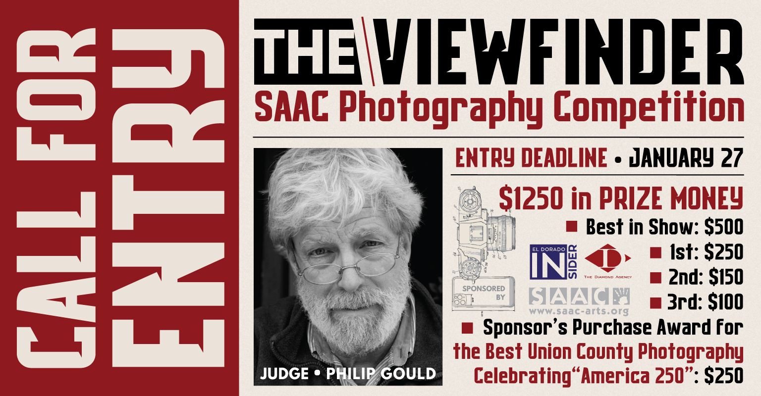 Please welcome celebrated documentary and architectural photographer Philip Gould, of Lafayette, Louisiana, as the judge for this year’s “Viewfinder” photography competition. Sponsored by The El Dorado Insider and The Diamond Agency, the exhibition will be on display in SAAC’s Price and Merkle Galleries February 2–March 1, 2026, with an entry deadline of January 27.