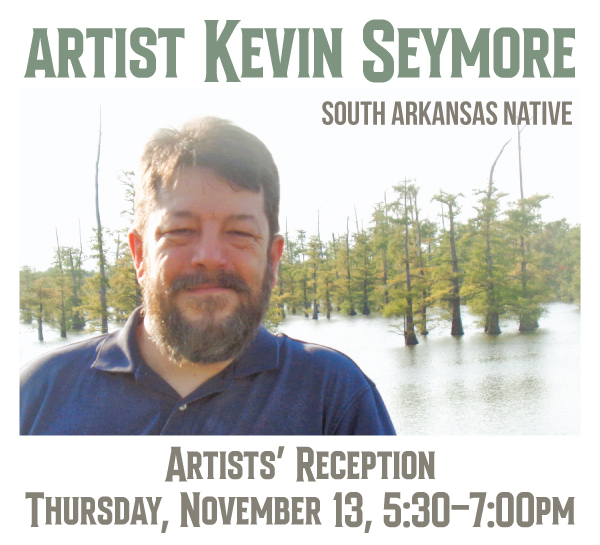 South Arkansas native Kevin Seymore debuts his first solo exhibition, “Waterland, Paintings from Felsenthal,” at SAAC this November. The show will be on view in SAAC’s Lobby Gallery from November 3 through December 12, with a public artist’s reception on Thursday, November 13, from 5:30 to 7:00pm.