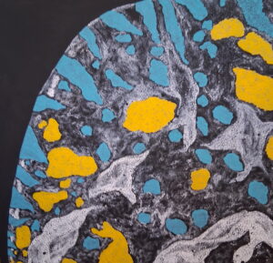 Her newest collection, “Naturally Abstract,” turns its gaze toward the microscopic wonders of nature. Using magnified imagery of butterfly wings, beetles, flowers, and other organic forms, Magee translates the unseen intricacies of creation into vivid, textural abstractions. “What God has given us through the building blocks of life is amazing,” she reflects. The exhibition continues her commitment to blending art, faith, and curiosity in ways that challenge and inspire.