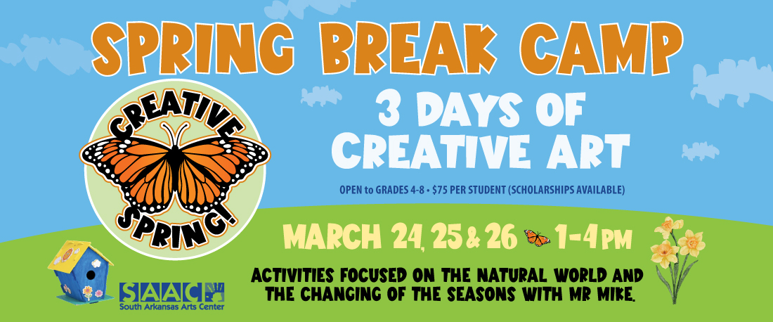 Register for Spring Break Camp online. For more information or assistance with scholarship applications, call the SAAC office 870-862-5474. The South Arkansas Arts Center is open to the public Monday-Friday, 9am-5pm.