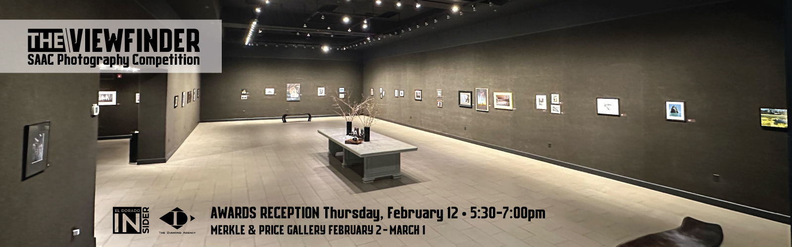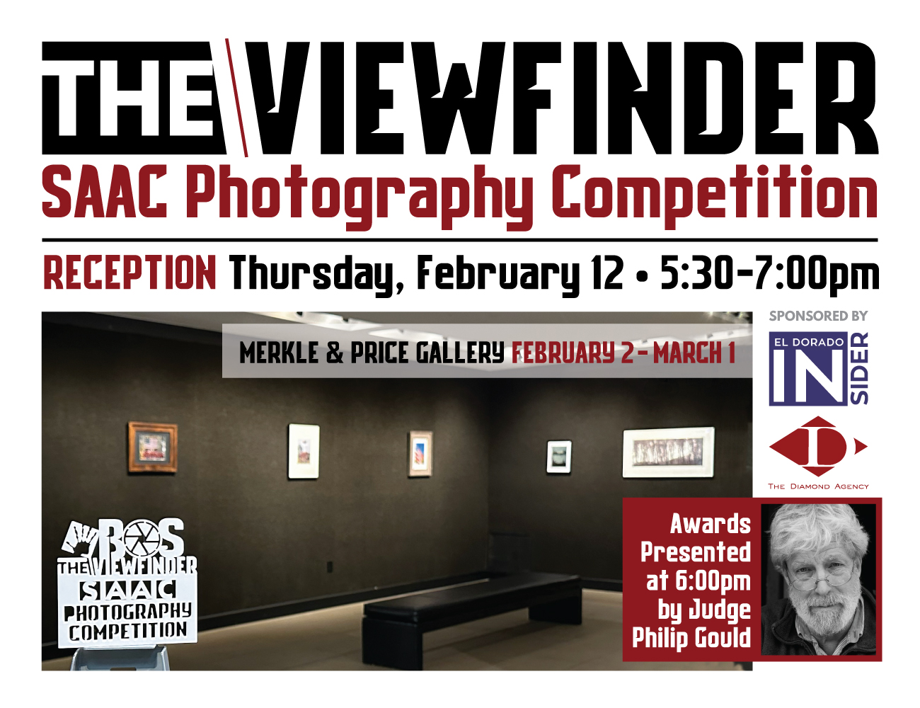 The Viewfinder Photography Competition Exhibit, sponsored by The El Dorado Insider and The Diamond Agency, will be on view in SAAC’s Price and Merkle Galleries from February 2 through March 1, 2026. SAAC invites the public to a special artist reception on Thursday, February 12, from 5:30–7:00 PM, celebrating exhibitions hosted by the SAAC Visual Arts Committee. The reception is free and open to everyone.