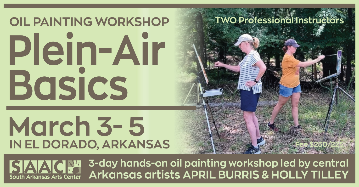 SAAC invites you to step outside and into the landscape with “Plein-Air Basics,” a hands-on oil painting workshop led by central Arkansas artists April Burris and Holly Tilley. The workshop will take place March 3–6, from 9:00 a.m. to 4:00 p.m. each day.